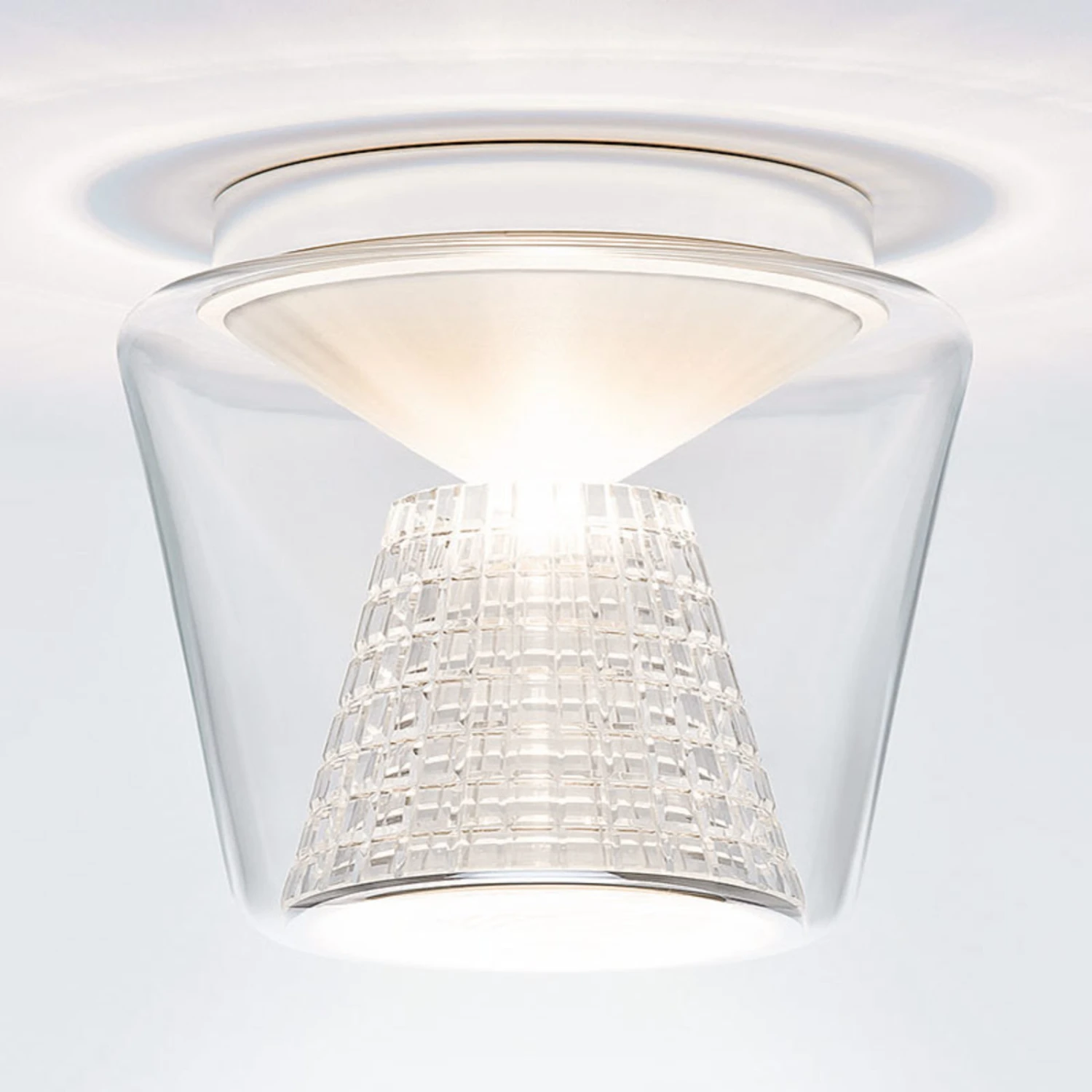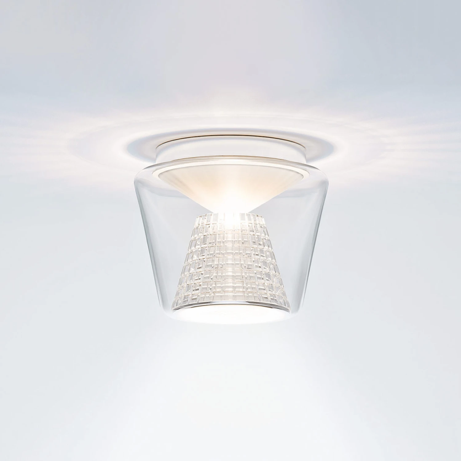 Konische Formen spielen bei Annex eine ganz große Rolle. Ausgehend von einem kegelförmigen, lichtdurchlässigen Silikonformteil wird das Licht der LEDs gleichmäßig in Richtung des Reflektors abgestrahlt, der bei dieser Variante von Annex aus facettiertem Kristallglas besteht, das wie geschaffen dafür ist, beeindruckende Lichteffekte im Raum zu erzeugen. Sowohl der Kristallglasreflektor wie auch die äußere Hülle aus mundgeblasenem, klarem Glas sind konisch geformt.