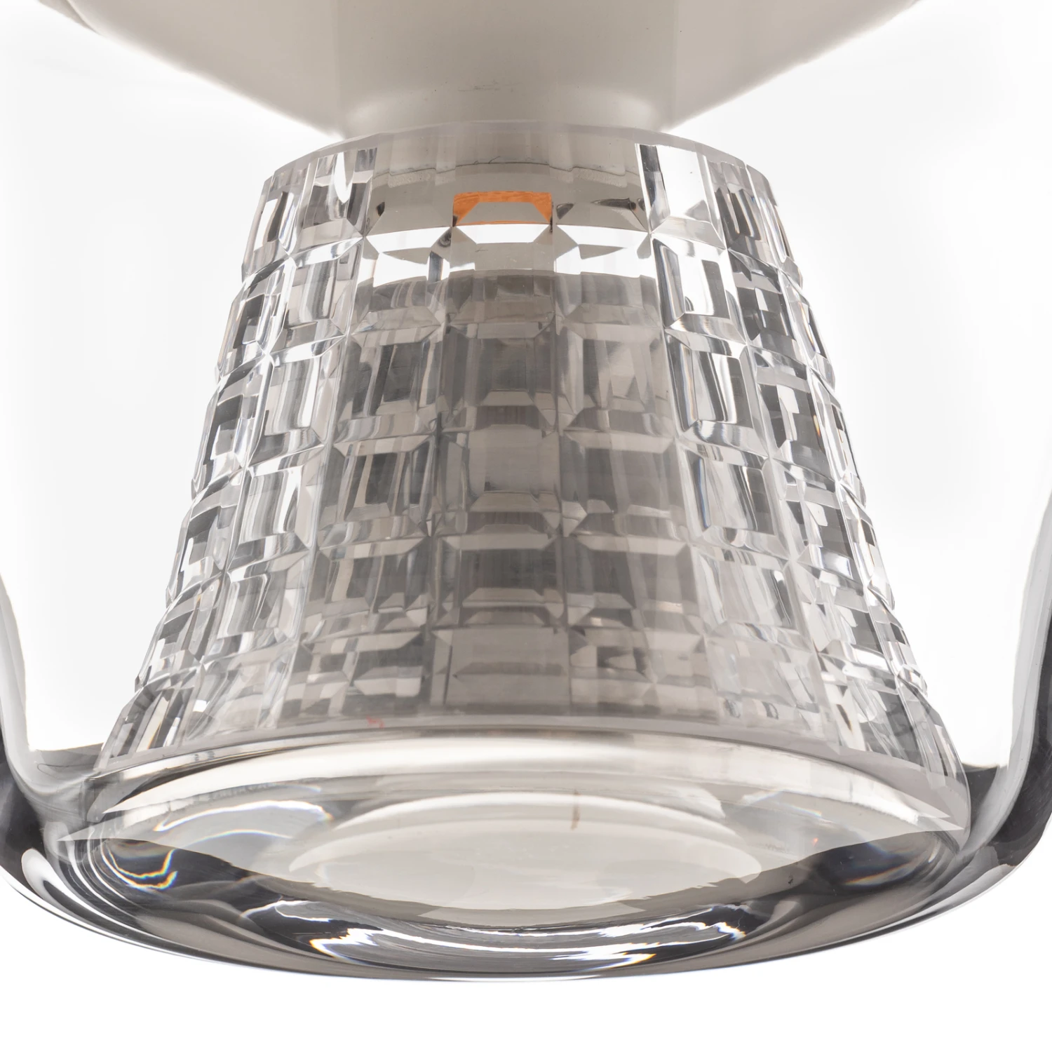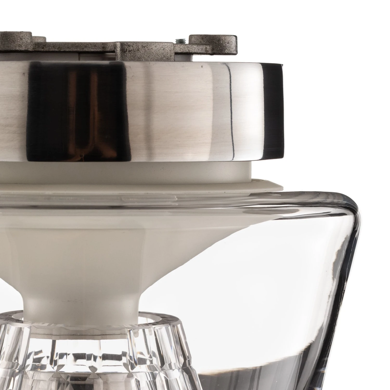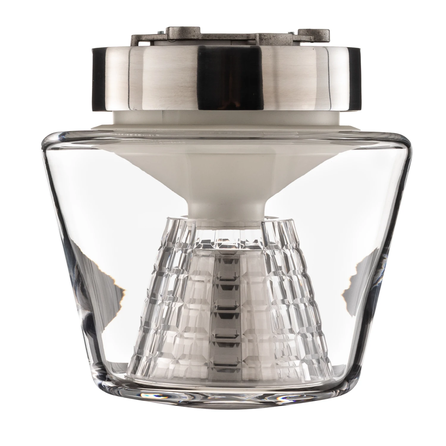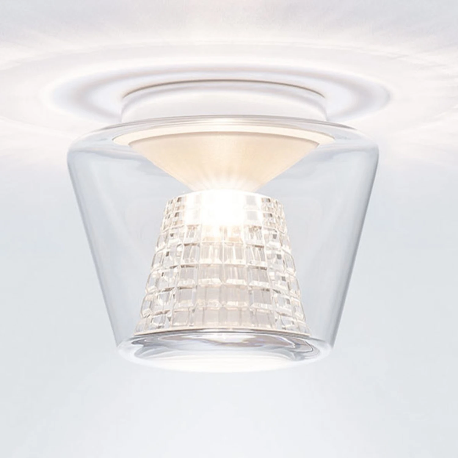 Konische Formen spielen bei Annex eine ganz große Rolle. Ausgehend von einem kegelförmigen, lichtdurchlässigen Silikonformteil wird das Licht der LEDs gleichmäßig in Richtung des Reflektors abgestrahlt, der bei dieser Variante von Annex aus facettiertem Kristallglas besteht, das wie geschaffen dafür ist, beeindruckende Lichteffekte im Raum zu erzeugen. Sowohl der Kristallglasreflektor wie auch die äußere Hülle aus mundgeblasenem, klarem Glas sind konisch geformt.