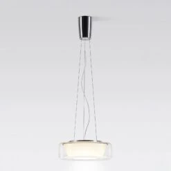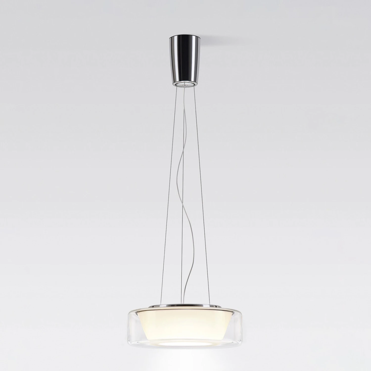 Die LED-Pendelleuchte Curling L ist eine gekonnte Kombination aus nachhaltiger, ausgereifter LED-Technik und einer zeitlos eleganten Form. Die Leuchte mit einem mundgeblasenen, klaren Glasschirm in flacher Zylinderform und einer manuell ausrichtbaren Aufhängung aus schlanken Stahlseilen passt in jedes Interieur und eignet sich nicht nur perfekt für private Räume, sondern auch zum Einsatz im Objekt- oder Gastronomiebereich. Baldachin und Gehäuse der Leuchteinheit sind aus Aluminium in glänzendem Finish gearbeitet und verleihen Curling L einen modernen Charakter. An zwei Magnetpunkten ist unter der Lichtquelle ein optischer Einsatz befestigt, der mit seinem speziellen Schliff für eine optimale Verteilung aus Direktlicht und ringsum abgestrahlter Grundbeleuchtung sorgt.