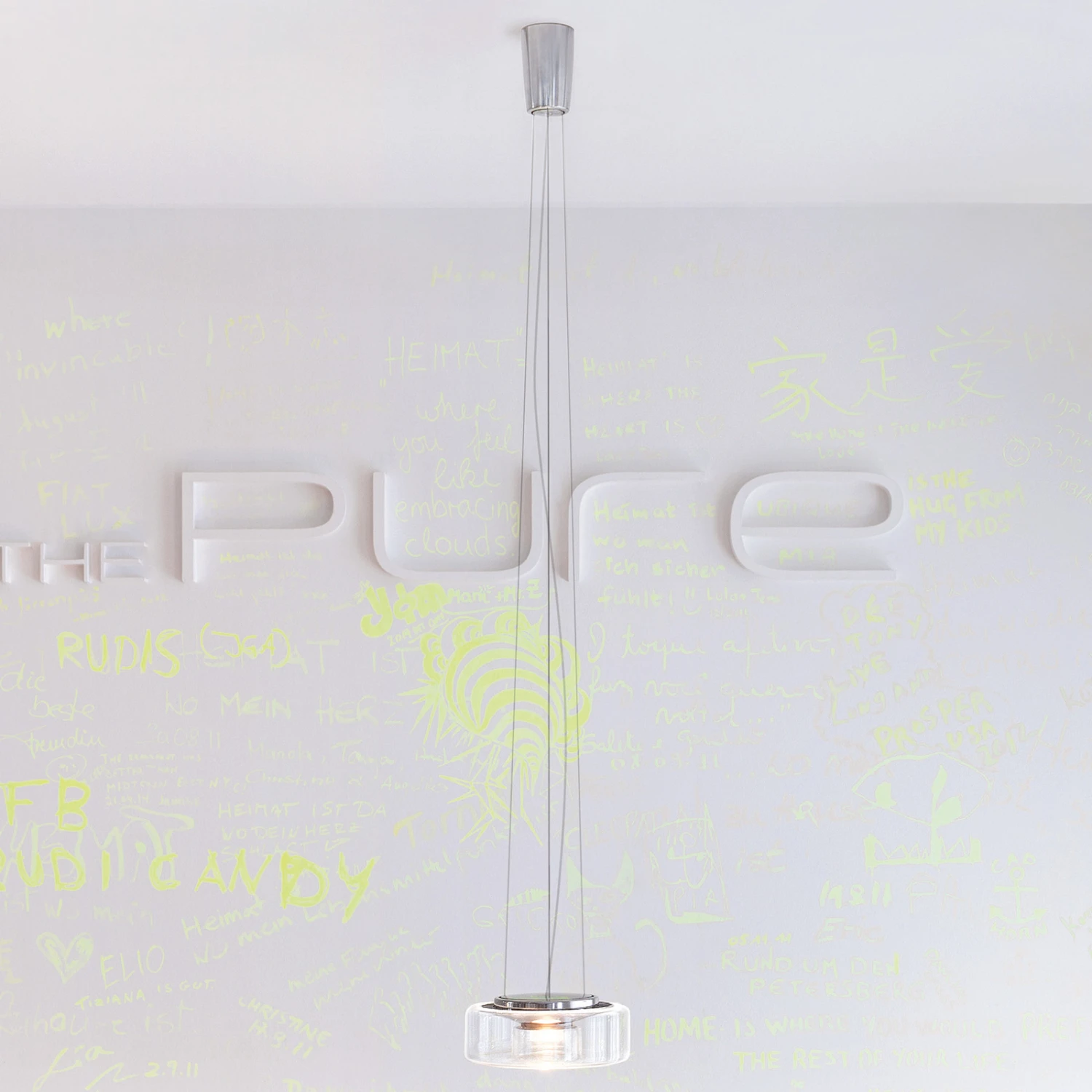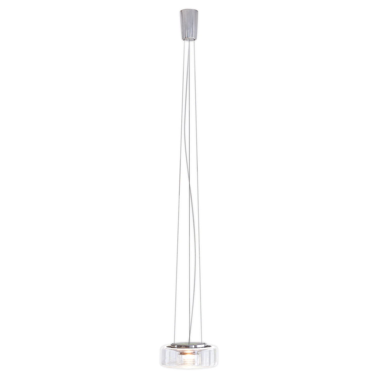 Der feine, klare Glaskörper in flacher Zylinderform ist mundgeblasen. Das Gehäuse der LED-Einheit besteht, ebenso wie der Baldachin, aus poliertem Aluminium. Die Aufhängung erfolgt mittels schlanker Stahlseile, deren Länge bei der Montage angepasst werden kann. Der Glasschirm ist zur Reinigung in der Spülmaschine geeignet; er lässt sich dank eines Bajonettverschlusses werkzeuglos abnehmen und befestigen. Die LED-Einheit kann bei Defekt oder am Ende der Lebensdauer ausgetauscht werden.