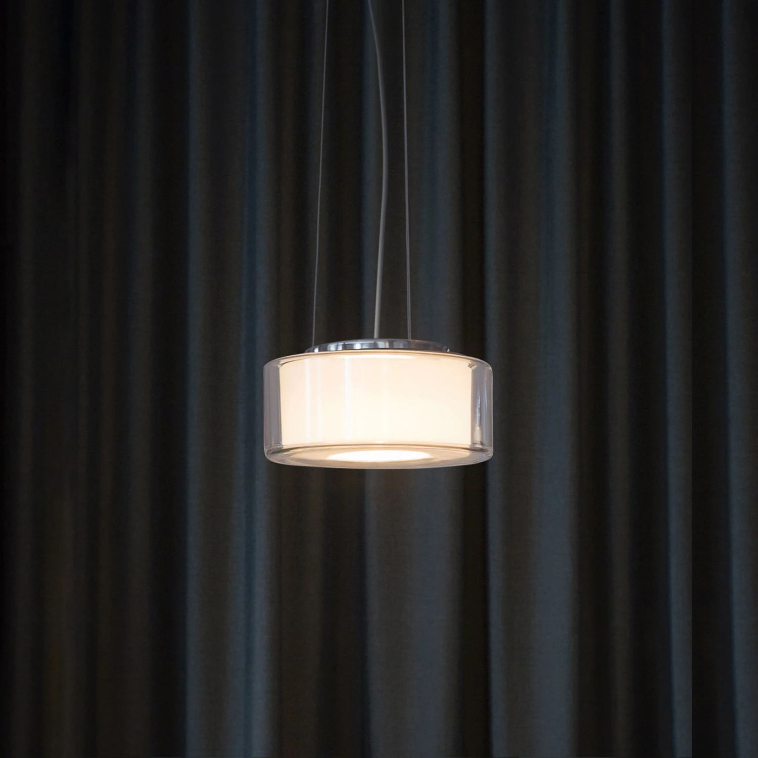 Im Inneren des Schirms, der aus mundgeblasenem Glas in Deutschland gefertigt wird, findet sich in dieser Ausführung ein zylindrischer Reflektor aus opalem Polycarbonat. Dieser lässt seitlich sowie nach oben das warmweiße Licht nur sanft durchscheinen. Auch unterhalb der integrierten LEDs, die warmweißes Licht mit ausgezeichneter Farbwiedergabe emittieren, ist ein weiterer Diffusor angebracht, der eine homogene Beleuchtung des unterhalb gelegenen Bereichs gewährleistet.