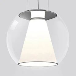 Die LED-Hängeleuchte Draft ist ein Objekt von zeitgenössischer Prägnanz. In Anlehnung an eine klassische Kugelleuchte entstand eine Lichtquelle mit perfekt ausbalancierter Lichtwirkung. Im mundgeblasenen Glasschirm ist ein konischer Reflektor platziert, dessen opales Polycarbonat einerseits einen optischen Kontrast zum durchsichtigen Glas bildet und andererseits die Lichtwirkung entscheidend beeinflusst. So wird ringum eine weich gestreute Grundbeleuchtung erzielt. Beispielsweise ein unterhalb gelegener Tisch wird mit direktem Licht versorgt, wobei eine Diffusorscheibe ebenfalls eine gleichmäßige Lichtstreuung bewirkt. Die in der Leuchteinheit mit glänzendem Aluminiumgehäuse integrierten LEDs sorgen für eine sehr gute Wiedergabe der Farben in der Umgebung. Die Stahlseilabhängung lässt sich werkzeuglos ausrichten und die LED-Einheit ist dank eines patentierten Systems austauschbar.