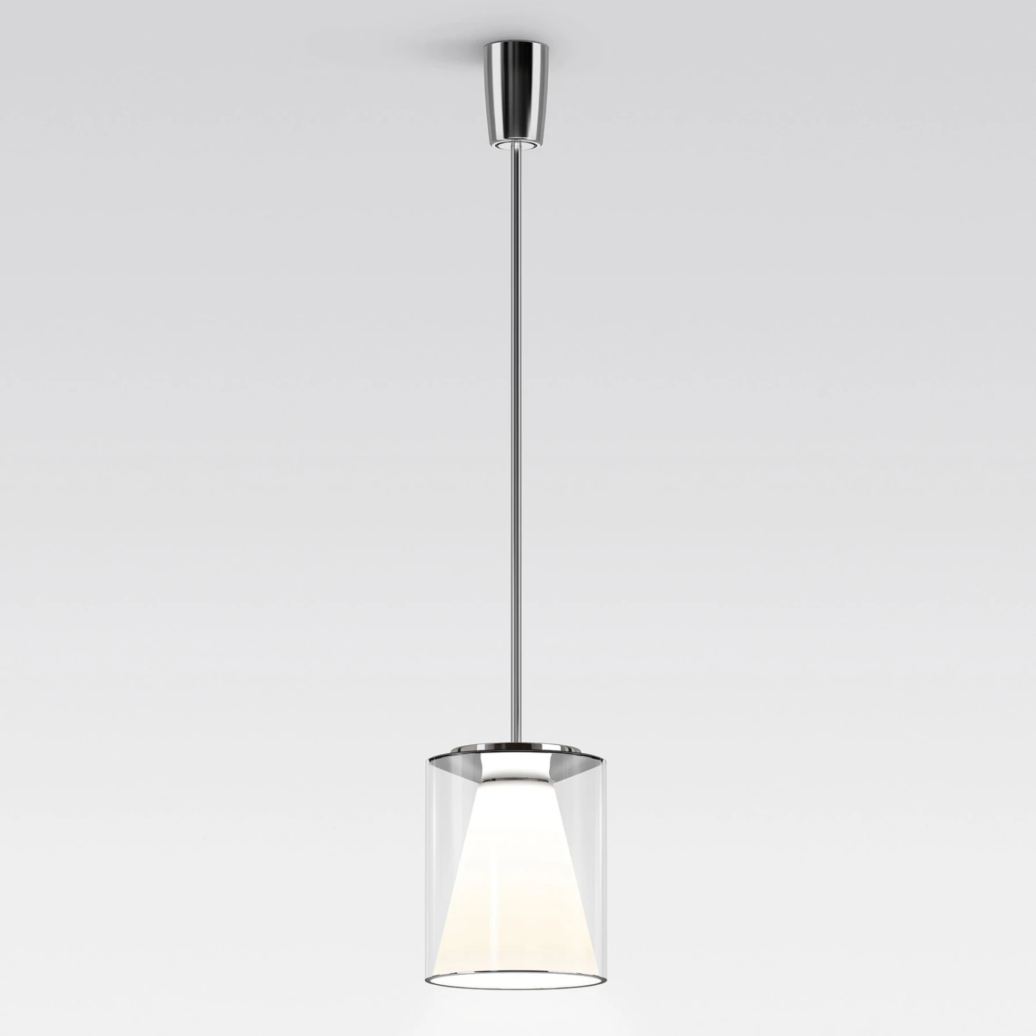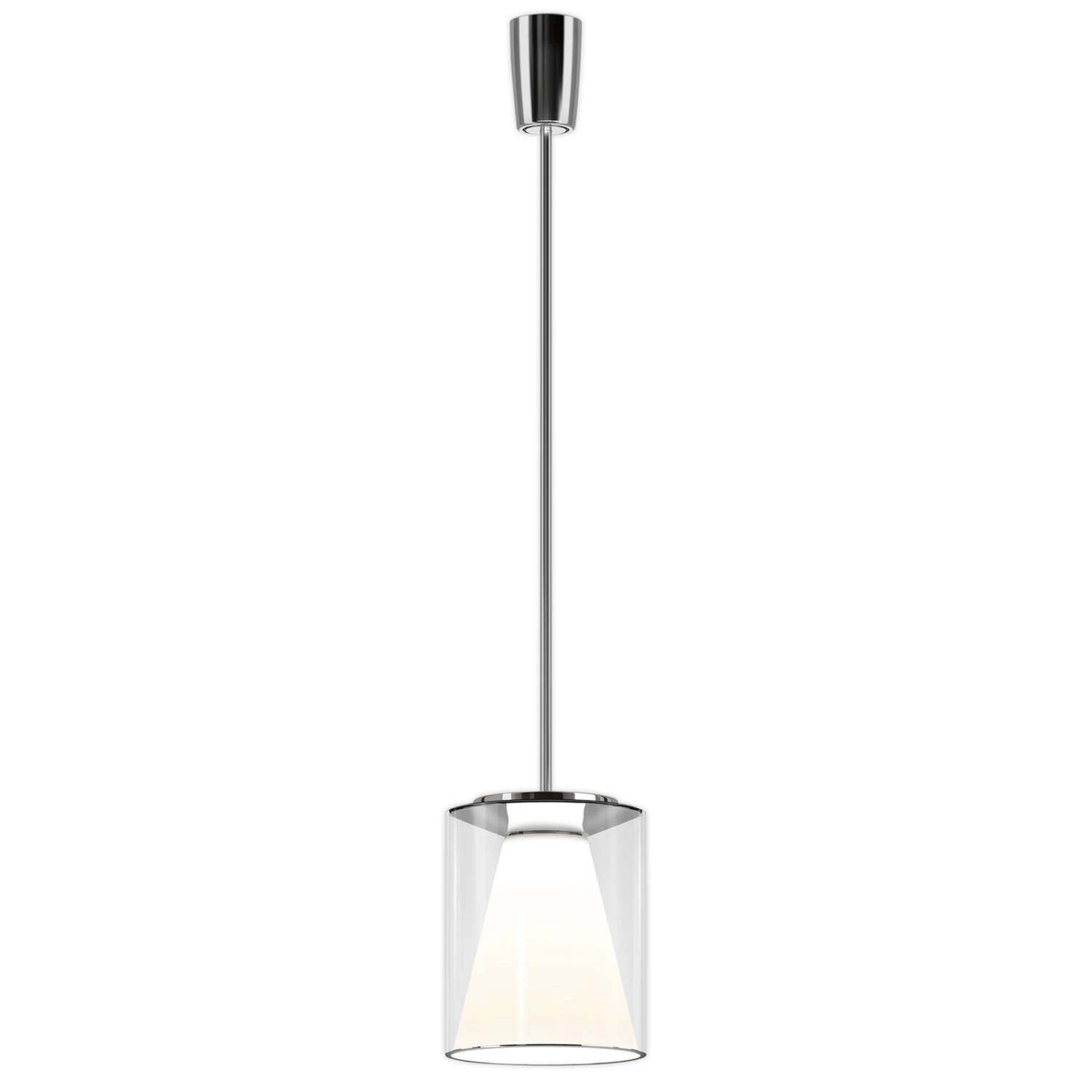 LED-Pendelleuchte Drum M mit Glasschirm und Innenreflektor, Aufhängung an verchromtem Stahlrohr