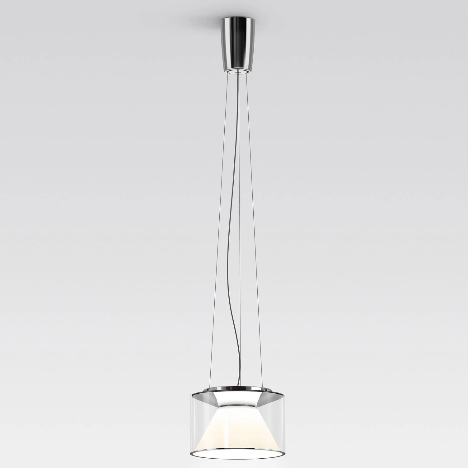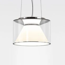 Drum M ist eine energieeffiziente LED-Hängeleuchte, die mit einer angenehmen Lichtwirkung und einer vielseitig kombinierbaren Optik in zahlreichen privaten und öffentlichen Innenräumen zur Beleuchtung von Tischen und vielem mehr genutzt werden kann. Die Leuchte besteht aus einer werkzeuglos ausrichtbaren Stahlseilaufhängung und einem einzigartigen Schirm. Dieser ist doppellagig aufgebaut – mit einem Außenzylinder aus klarem, mundgeblasenem Glas und einem inneren Kegel aus opalem Polycarbonat. Das Licht wird gerichtet nach unten und rundum weich gestreut ausgestrahlt, wobei die Farben im Raum hervorragend wiedergegeben werden. Drum M passt in viele Einrichtungsstile und beleuchtet in Perfektion Theken oder Tische, ob einzeln oder zu mehreren in Reihe oder im Cluster montiert. Mit externen Dimmern (TRIAC) lässt sich der Lichtoutput regeln. Ein patentiertes Wechselsystem macht den Austausch der LED-Leuchteinheit, die in einem glänzendem Aluminiumgehäuse untergebracht ist, bei Defekt oder nach Ende der Lebensdauer möglich.