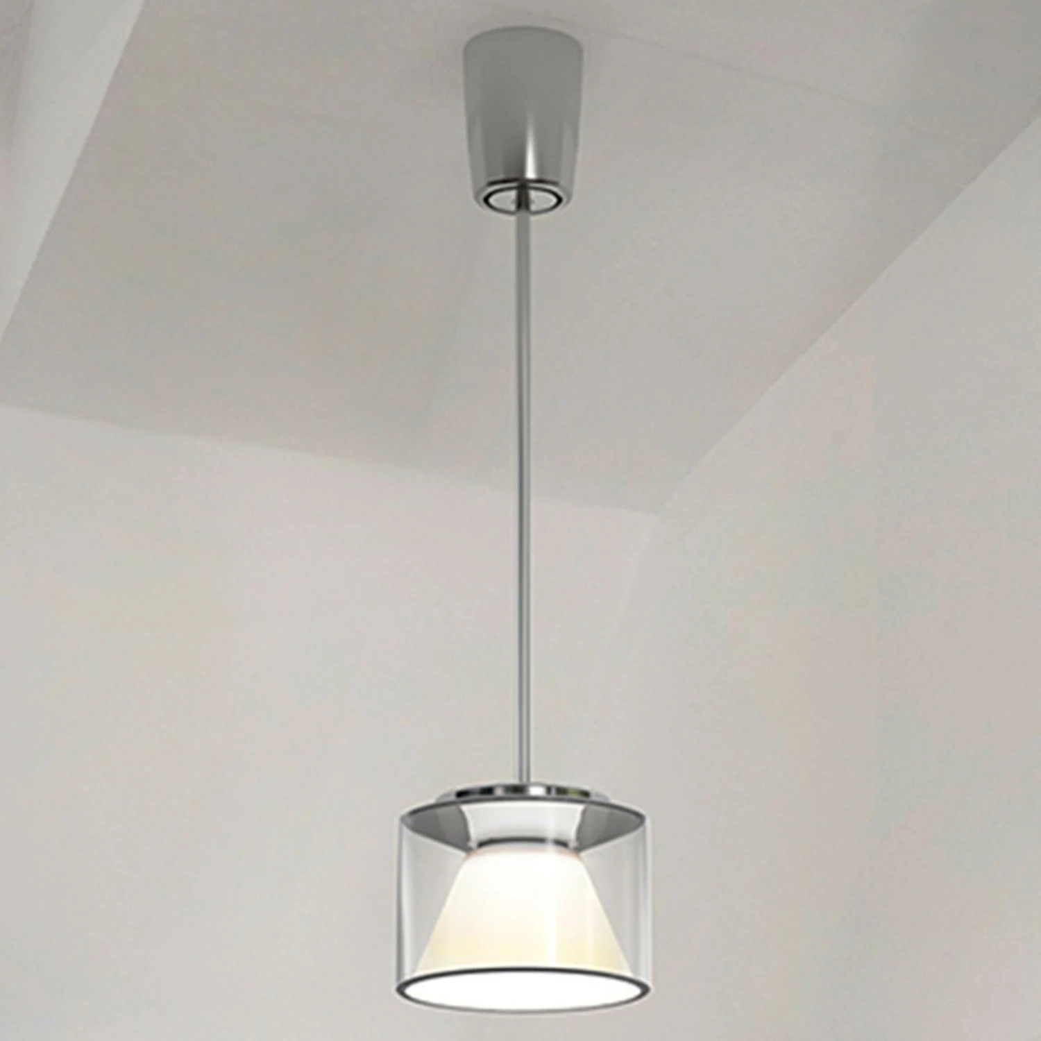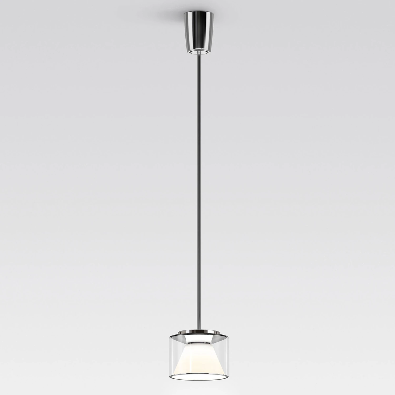 Drum S – LED-Hängeleuchte mit klarem Glasschirm und opalem Innenreflektor – Aufhängung an verchromtem Stahlrohr