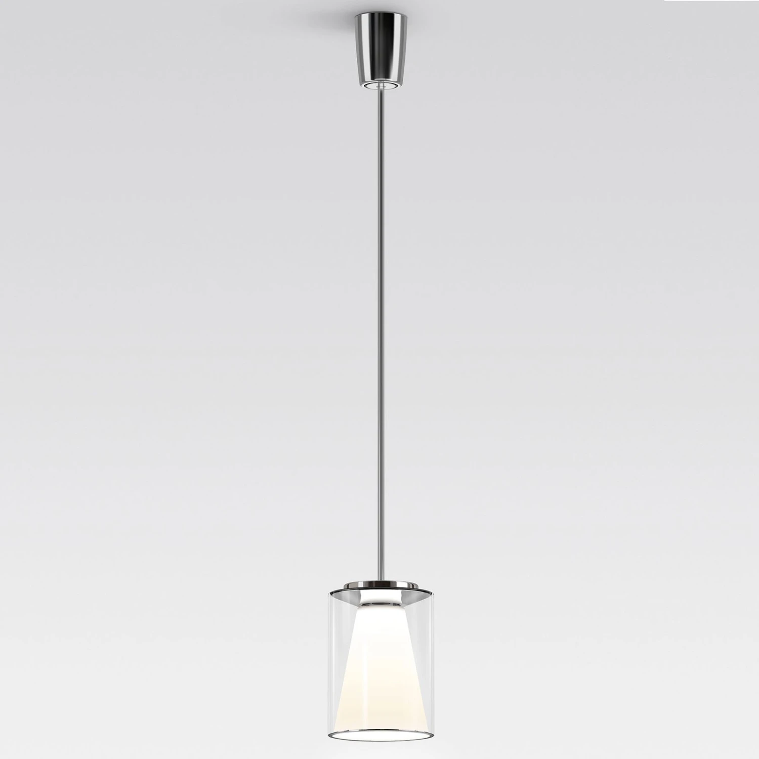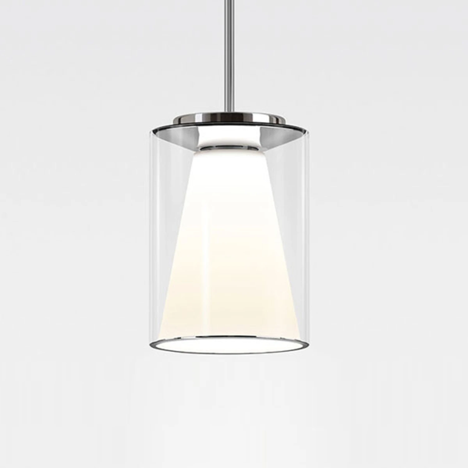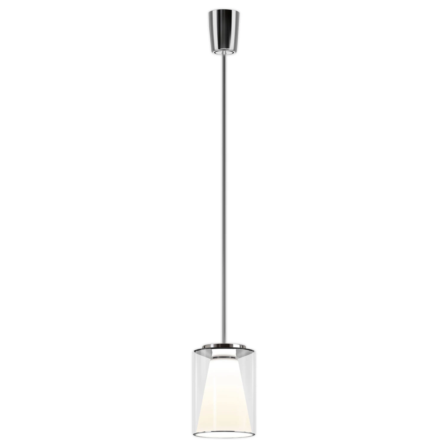 Drum S – LED-Hängeleuchte mit klarem Glasschirm und opalem Innenreflektor – Aufhängung an verchromtem Stahlrohr