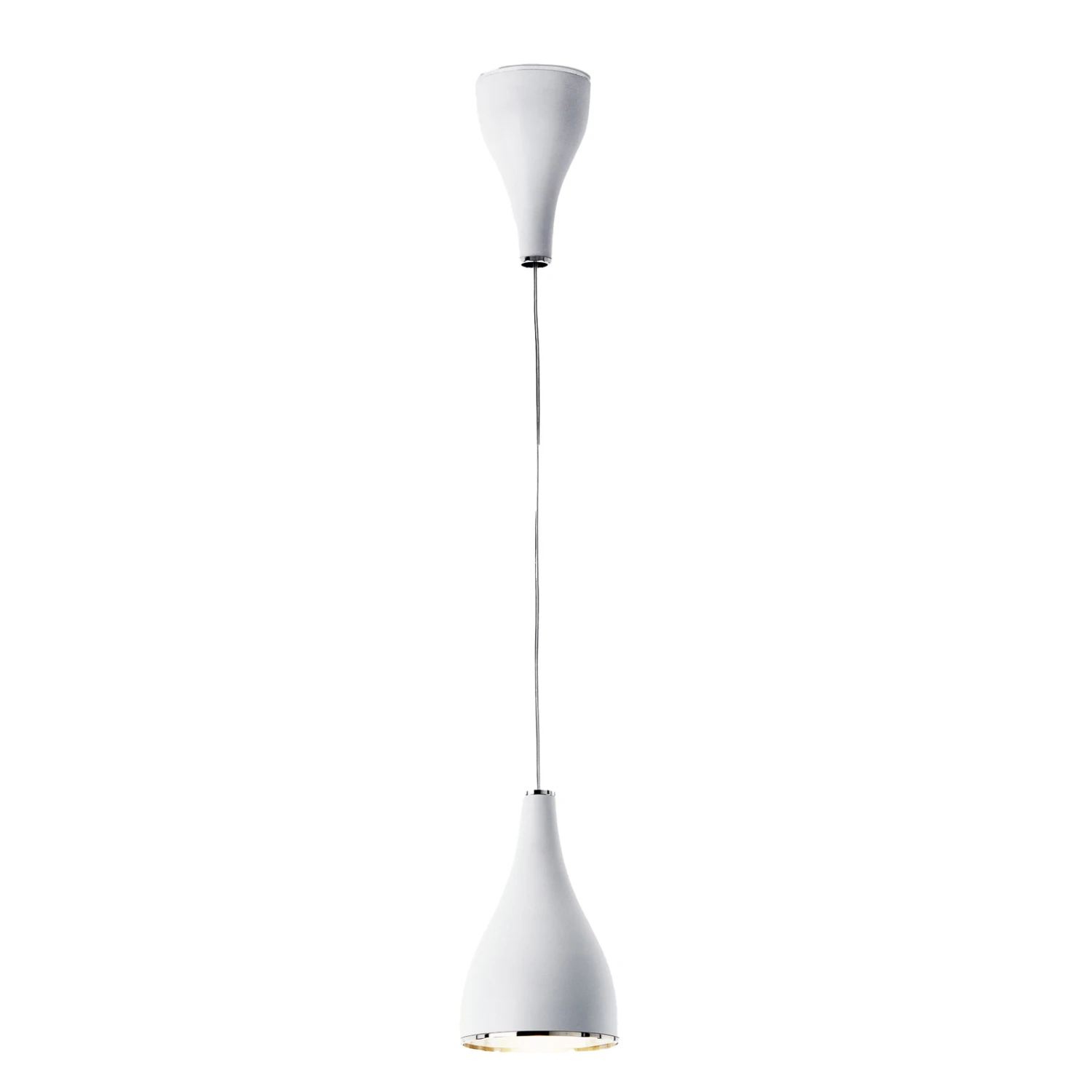 Schirm und Baldachin bestehen aus Aluminium. Sie entsprechen sich in Form und Oberfläche, so dass sich der Schirm an der Decke zu spiegeln scheint. In der Version L ist der Schirm größer, so dass eine E27-Lampe im Schirm Platz findet.