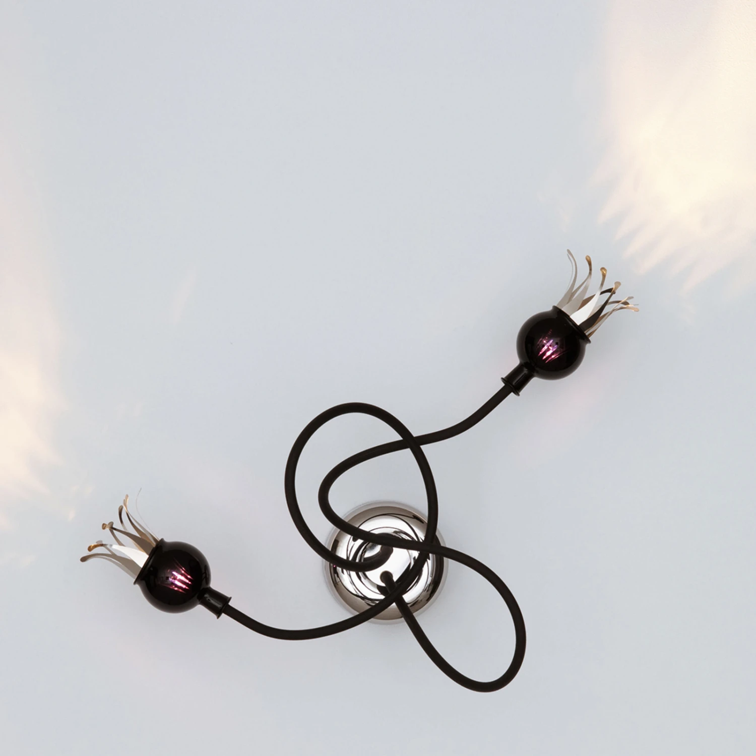 Die Sinnlichkeit dieses Beleuchtungsobjekts ist im Bereich ihrer Lichtquellen zu suchen – das Herzstück einer jeden Leuchte. Diese liegen bei Poppy verborgen in zwei schwarz-violetten Körpern aus mundgeblasenem Glas. Als sei der Lichtschein, der durch das außergewöhnlich gefärbte Glas nach außen tritt und die Glaskörper sanft violett illuminiert, noch nicht genug, so findet sich hier ein weiterer Clou der Leuchte. Um die Optik und den Effekt einer sich öffnenden und schließenden Blüte zu realisieren, wurden an der Öffnung des Glaskörpers dünne Lamellen aus Bimetall befestigt. Das aus zwei Schichten unterschiedlicher Metalle zusammengesetzte Material reagiert auf den Einfluss von Wärme. Und so öffnen sich Poppys Blütenblätter innerhalb weniger Minuten auf sinnliche Weise, wenn die Leuchte eingeschaltet wird und die Wärme des Leuchtmittels die Lamellen erreicht. Spätestens jetzt entlockt diese wundersame Wandleuchte ihrem Betrachter ein Lächeln.