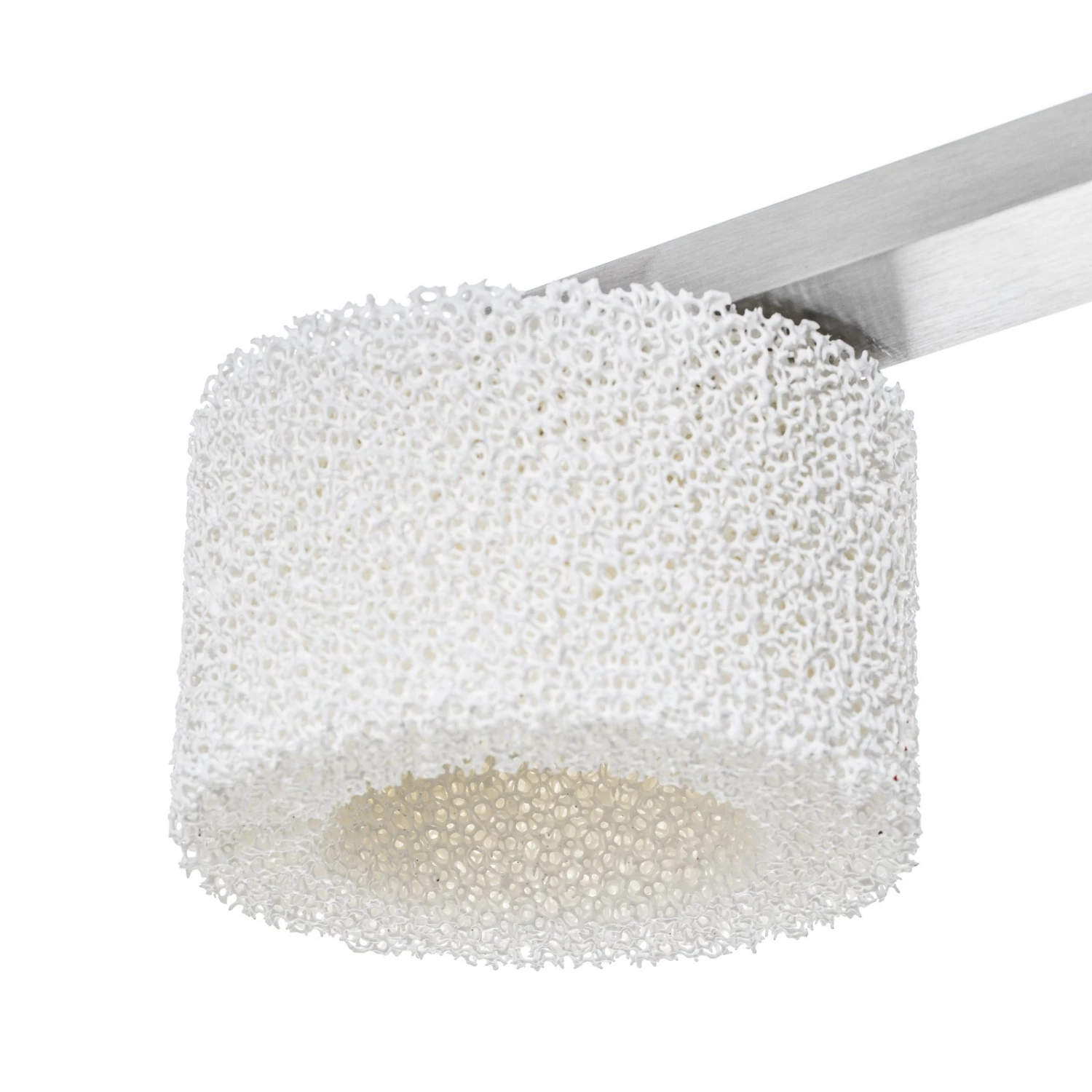 Sanft und weich illuminiert der warmweiße Lichtschein die vier Schirme der Balkenpendelleuchte Reef von innen heraus und lässt die ungewöhnliche Oberflächenstruktur der Schirme sichtbar werden. Jetzt erkennt man sie, die Höhen und Tiefen dieser schwammähnlichen Struktur, die von dem einfallenden Licht nicht besser inszeniert werden könnten. Doch was ist das eigentlich für ein besonderes Material, das mit seiner interessanten Beschaffenheit der Pendelleuchte Reef zu einem solch extravaganten Aussehen verhilft? Um bei der Lichtwirkung sozusagen einen Special Effect zu erzielen, fiel die Wahl des Schirmmaterials auf Keramikschaum – ein Werkstoff, dem seine zellartige Struktur seinen unverwechselbaren Charakter verleiht und der geradezu prädestiniert dafür ist, für die Erschaffung einzigartiger Leuchtenkunstwerke verwendet zu werden. Mühselig muss sich das Licht seinen Weg vom Schirminneren durch die vielen korallenähnlichen Verzweigungen nach außen bahnen, um dann aber auf überaus effektvolle Weise in die Umgebung gestreut zu werden. Dennoch kommt die Helligkeit hier alles andere als zu kurz. Der durch den Keramikschaum sanft gestreute, diffuse Lichtschein wird ergänzt von direktem, nach unten gerichteten Licht. Denn so erfüllt Reef den Zweck, den ihre Balkenform schon erahnen lässt: die Beleuchtung von großen Esstischen und langen Speisetafeln.